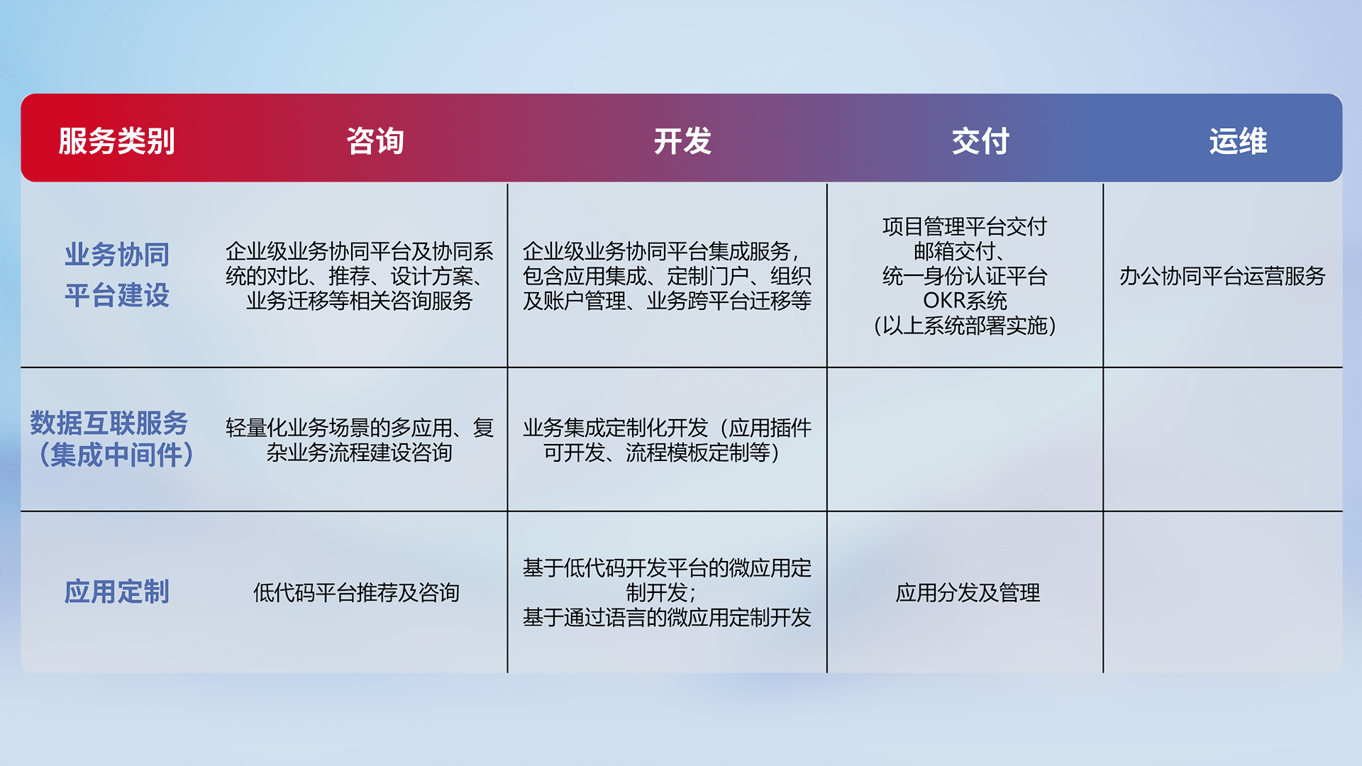 针对钉钉、、、、企微、、IDaas等平台级产品提供产品的规划、、、、方案、、、、交付、、定制化开发等服务,,,,实现如统一协同办公、、智能客户服务、、混合会议管理、、、智能数据查询、、、、等业务场景,,,实现数字化转型。。