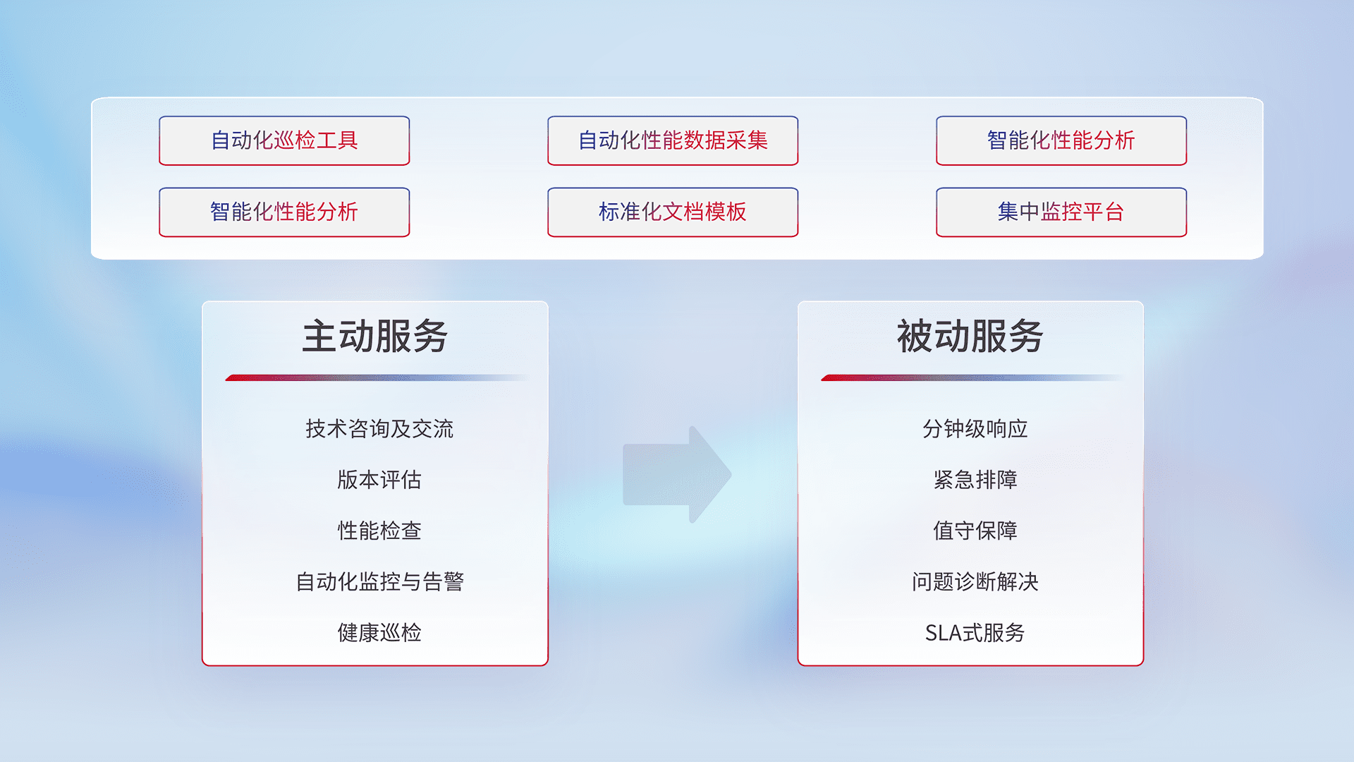 智能化工具和标准化文档,,,保障服务质量,,,提供主动服务(包含技术咨询、、、版本评估、、性能检查、、、自动化监控与告警、、、健康巡检)和被动服务包含(分钟级响应、、、、紧急排障、、、、值守保障、、、问题诊断解决、、SLA服务)。。